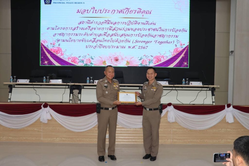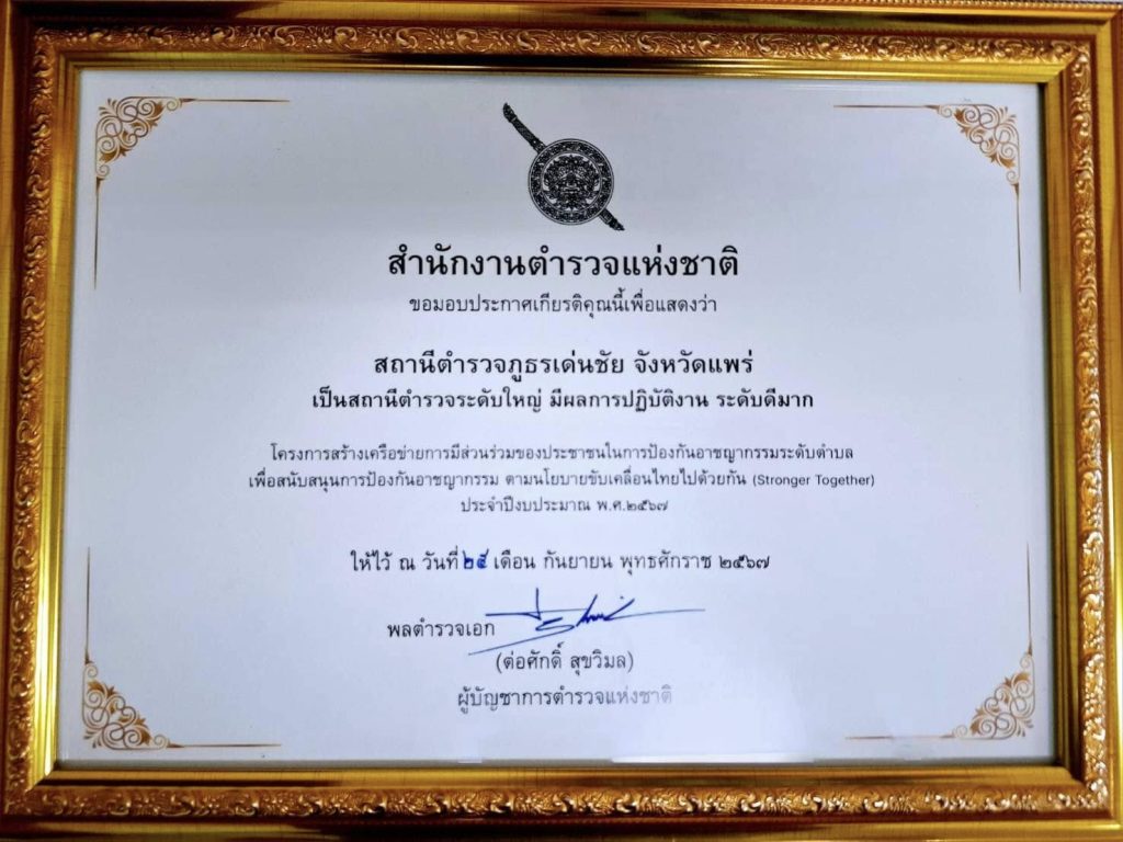 เมื่อวันที่ 29 ต.ค.67 เวลา 10.00 น. พล.ต.ท.กฤตธาพล ยี่สาคร ผบช.ภ.5 มอบประกาศเกียรติคุณให้กับ สถานีตำรวจภูธรเด่นชัย รับมอบโดย พ.ต.อ.เบน วงศ์เครือ ผกก.สภ.เด่นชัย ว่าเป็นสถานีตํารวจระดับใหญ่ มีผลการปฏิบัติงาน ระดับดีมาก โครงการสร้างเครือข่ายการมีส่วนร่วมของประชาชนในการป้องกันอาชญากรรมระดับตําบล เพื่อสนับสนุนการป้องกันอาชญากรรม ตามนโยบายขับเคลื่อนไทยไปด้วยกัน (Stronger Together)ประจําปีงบประมาณ พ.ศ.2567