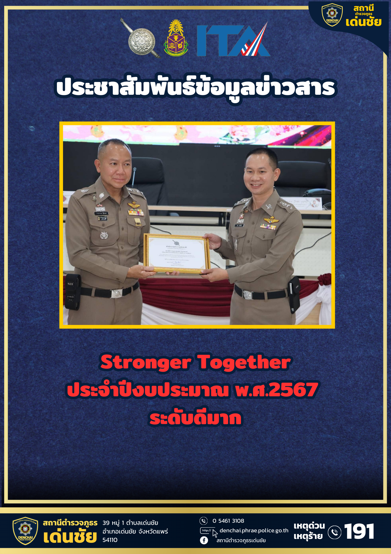 รับใบประกาศเกียรติคุณ โครงการสร้างเครือข่ายการมีส่วนร่วมของประชาชนในการป้องกันอาชญากรรมระดับตําบล เพื่อสนับสนุนการป้องกันอาชญากรรม ตามนโยบายขับเคลื่อนไทยไปด้วยกัน (Stronger Together)ประจําปีงบประมาณ พ.ศ.2567 ระดับดีมาก