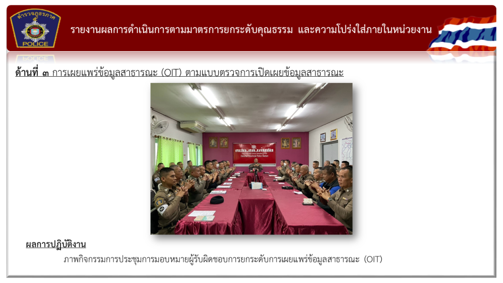 - กิจกรรมหรือการดำเนินการที่สอดคล้องกับมาตรการยกระดับคุณธรรมและความโปร่งใสภายในหน่วยงานตามข้อ O24 ที่สถานีตำรวจได้ดำเนินการ ดังนี้